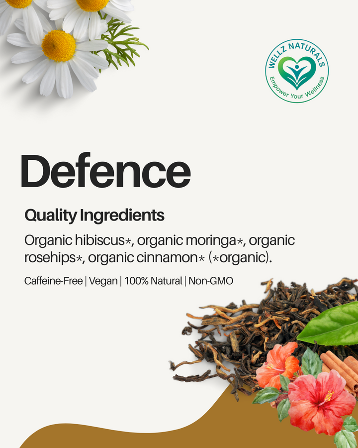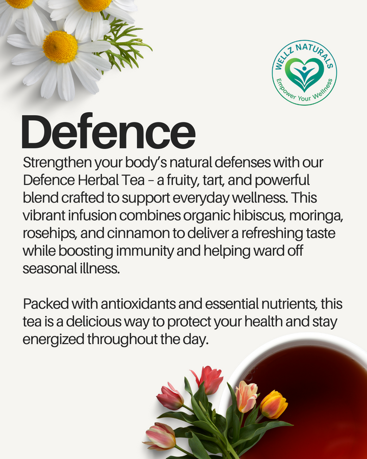 Strengthen your body’s natural defenses with our Defence Herbal Tea – a fruity, tart, and powerful blend crafted to support everyday wellness. This vibrant infusion combines organic hibiscus, moringa, rosehips, and cinnamon to deliver a refreshing taste while boosting immunity and helping ward off seasonal illness.
