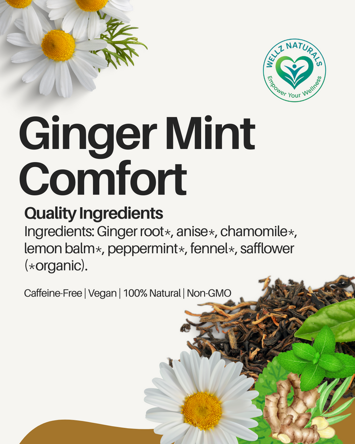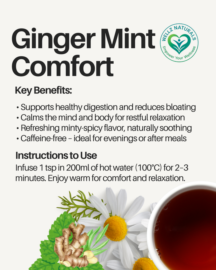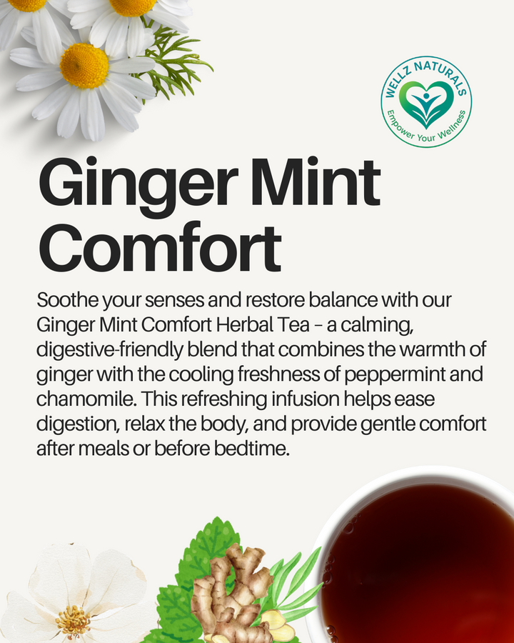 - 🌿 Soothe your senses and restore balance with our Ginger Mint Comfort Herbal Tea – a calming, digestive-friendly blend that combines the warmth of ginger with the cooling freshness of peppermint and chamomile.