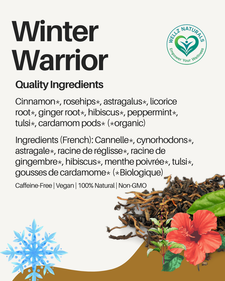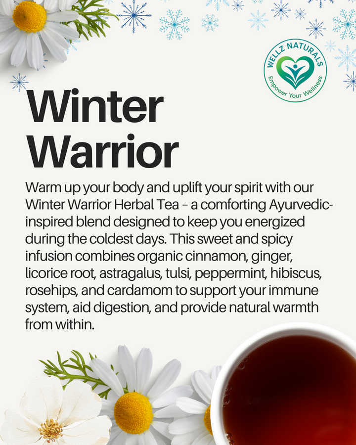 Warm up your body and uplift your spirit with our Winter Warrior Herbal Tea – a comforting Ayurvedic-inspired blend designed to keep you energized during the coldest days. This sweet and spicy infusion combines organic cinnamon, ginger, licorice root, astragalus, tulsi, peppermint, hibiscus, rosehips, and cardamom to support your immune system, aid digestion, and provide natural warmth from within.